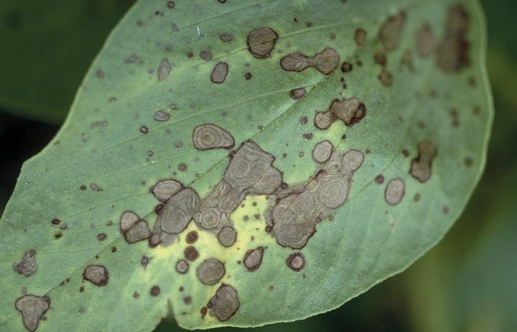 Се појавува како кружни кафени дамки на листовите кои може да се спојат и да предизвикаат сериозно оштетување.